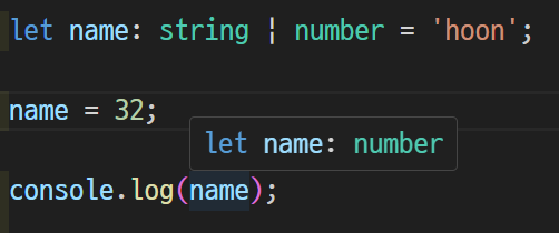 let name: string | number = 'hoon'; let age: (string | number) = 32; let home: number | string [] = [123,'TV','냉장고']2. 할당 하는 순간 타입이 확정이 됩니다.