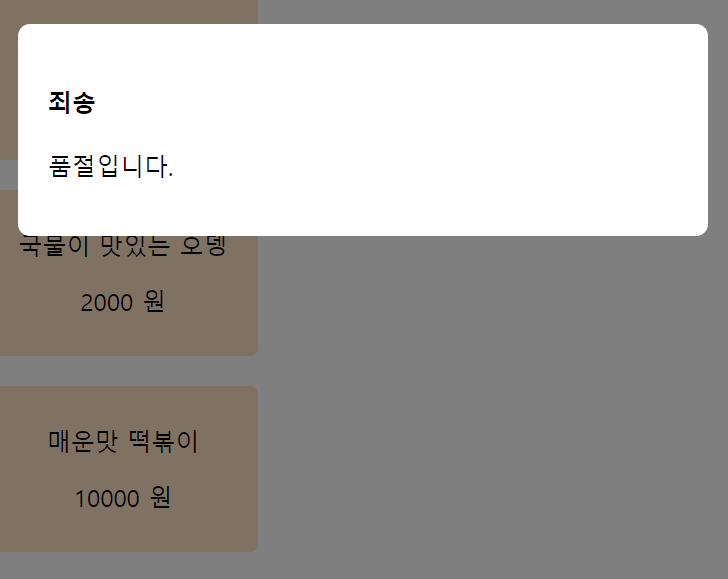 <div class="black-bg" v-if="modal == true"> <div class="white-bg"> <h4>죄송</h4> <p>품절입니다.</p> </div> </div>export default { name: 'App', data() { return { modal: true, menu_list: ['맛있는 붕어빵', '국물이 맛있는 오뎅', '매운맛 떡볶이'], price: [6000, 2000, 10000] } } }