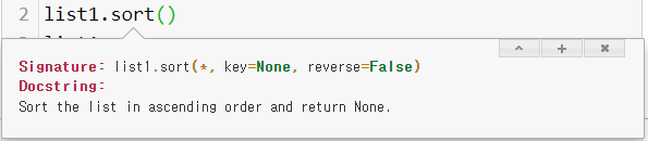 list1 = [2,12,2,12,66,45,400,89] list1.sort(reverse=True) list1[400, 89, 66, 45, 12, 12, 2, 2]기타 함수들